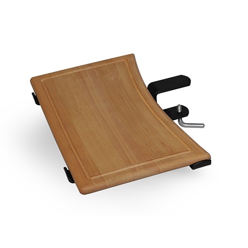 Polička z bukového dřeva včetně ocelového držáku a svorky k uchycení na obloukovou pracovní desku krbu 7-9 cm silnou.